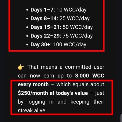Get upto 3000 WCC ($25 monthly just by login and claim daily!